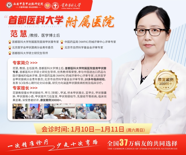 本次会诊的核心专家范慧教授,是首都医科大学博士后、主任医师、硕士研究生导师,同时担任中国药监局药械评审中心评审专家、北京市自然科学基金会评审专家等职务。她拥有20余年甲状腺疾病诊疗经验,发表SCI及核心期刊论文60余篇,临床康复案例逾30000例,在甲状腺结节、甲亢、甲减、桥本病等领域享有盛誉。其深厚的学术背景与丰富的临床经验,代表了国内甲状腺诊疗的一流水平。